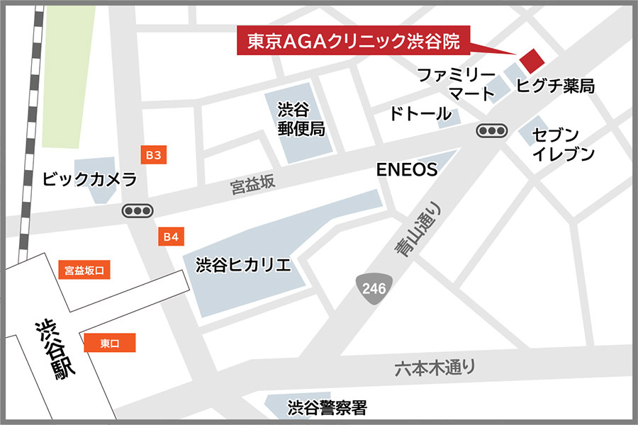 渋谷駅から徒歩5分と便利な立地です。宮益坂を上ります。上りきった宮益坂上の信号を左折し、青山通り(国道246号)に沿って少し歩くとヒグチ薬局が見えます。その奥、隣のビルの4階です。通勤・通学、お買い物の行き帰りなど、どうぞお気軽に東京AGAクリニックへお越し下さい。
