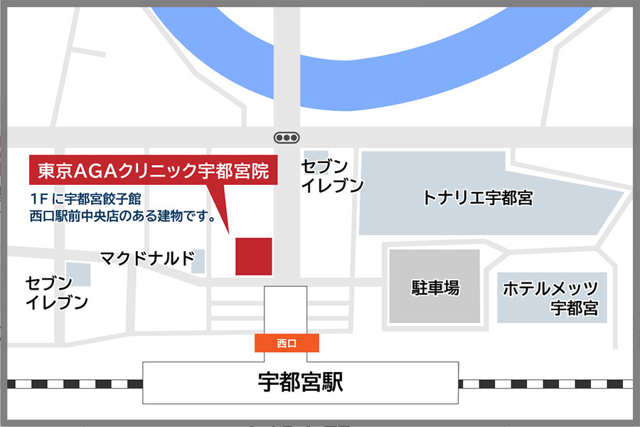 1Fに宇都宮餃子館西口駅前支店のある建物です。通勤・通学、お買い物の行き帰りなど、どうぞお気軽に東京AGAクリニックへお越し下さい。