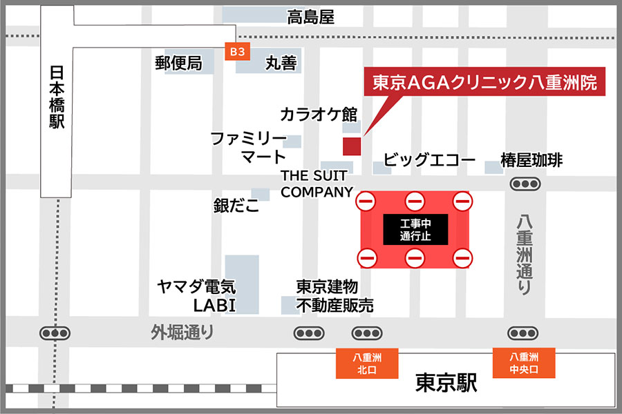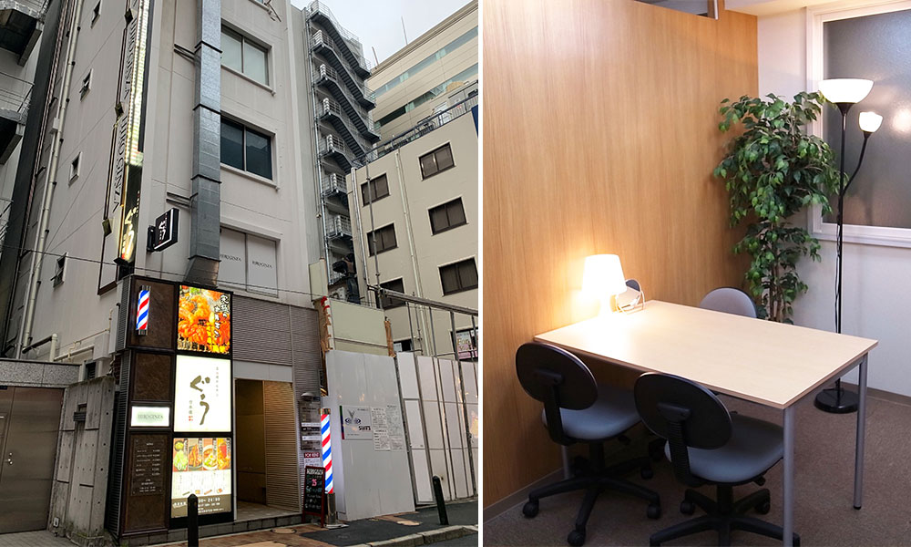 JR東京駅八重洲中北口より徒歩3分。東京メトロ日本橋駅から徒歩3分。東京駅八重洲北口を出て横断歩道を渡り、ヘヤギメとコーディアル証券のあいだの道を直進してひとつめの角を過ぎて左側のビルの5階。1階がホルモンぐぅのビルの5階です。