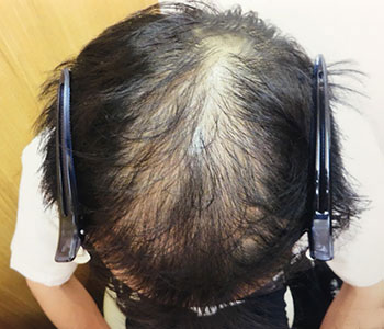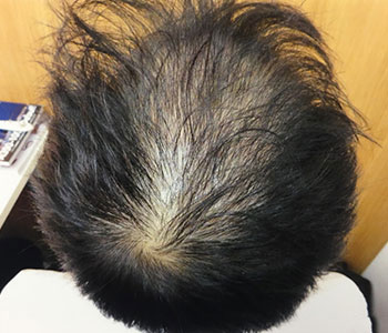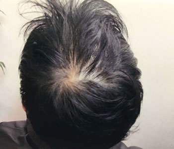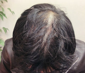 フロントから頭頂部にかけてかなり薄い状態になってしまっていました。当院の発毛プログラムでの発毛専門治療により、8ヶ月の時点で大幅に改善することができました。