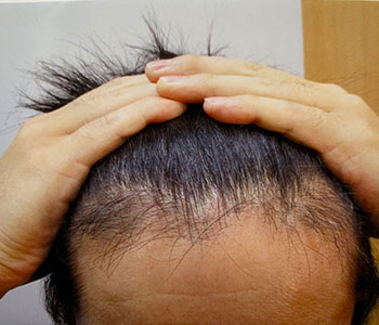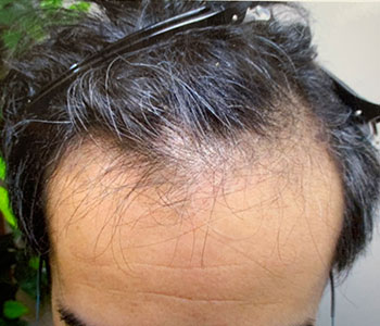 生え際がM字に後退しておりました。当院の発毛プログラムでの発毛専門治療により、5ヶ月でもしっかりと生え際に発毛している事が確認できます。