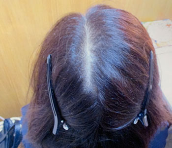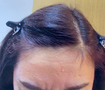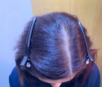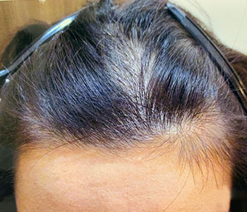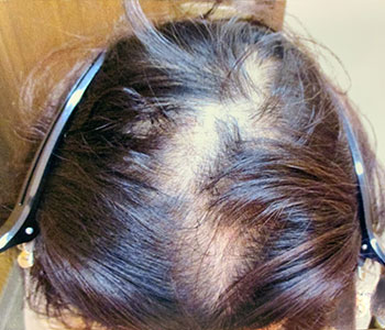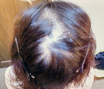 フロントから頭頂部までかなり地肌が露出した状態でした。当院のレディース発毛治療により、すっかり元の状態へ回復しております。患者さまが特にお悩みだった分け目も、著しく改善する事ができました。