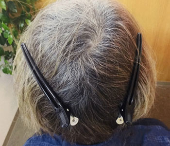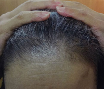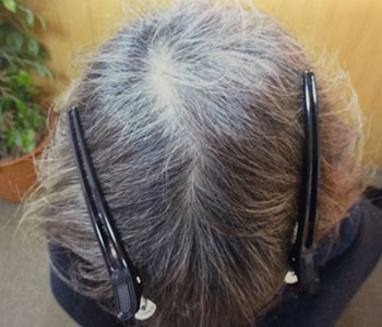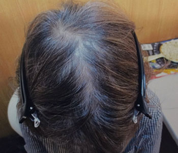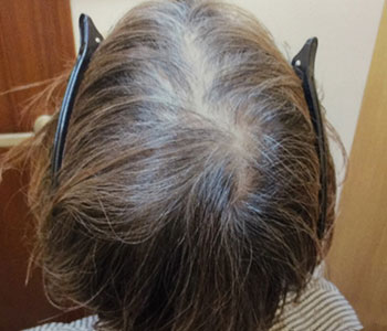 フロントから後頭部にかけて薄毛が進行している状態です。早期治療が出来たため、当院のレディース発毛治療5ヶ月後には、薄毛を感じさせないほどまで回復しております。