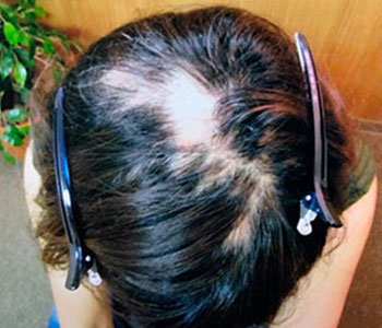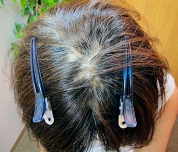 円形脱毛症の患者さまです。頭頂部を中心に周りも脱毛している状態です。当院のレディース発毛治療により、11ヶ月でしっかりと円形脱毛症は改善されました。