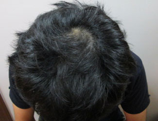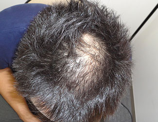 前髪は良いのですが、頭頂部が薄く露出でポッカリと地肌が見えている状態です。こういう状態の患者様は非常に多いです。当院の発毛プログラムでの発毛専門治療により、6ヶ月の時点でかなりの回復をいたしました。もう薄いという印象はありません。