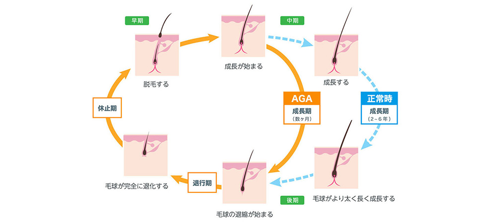 ジヒドロテストステロン(DHT)がもたらす影響は、ヘアサイクルの短縮です。具体的には髪が健やかに育つ「成長期」が短くなってしまい、毛髪1本1本の生涯が極端に短縮してしまいます。ご覧のように、本来2~6年あるとされる髪の成長期がわずか数ヶ月になってしまいますので、毛髪がしっかりと成長できず軟毛や抜け毛の量が増えてしまいます。