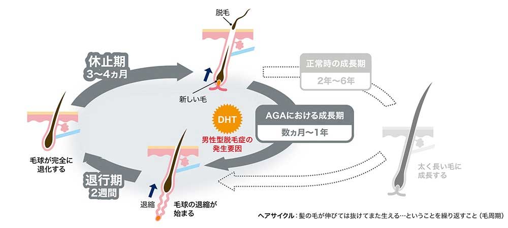 悪玉男性ホルモン「ジヒドロテストステロン(DHT)」は、毛髪1本1本の「成長期」を1年未満に短縮させてしまうと言われています。DHTの作用を受けると、本来まだまだ成長していいはずの毛根が「もう自分の役割は終わって生え変わる時期に来た…」と勘違いしてしまい、早々と「退行期」に移行しやすくなってしまいます。結果、これから太く長い毛に成長していくはずの毛髪が他の抜け落ちるべきタイミングの毛髪などと一緒になって脱毛してしまい、じわじわと薄毛が進行していくということになります。