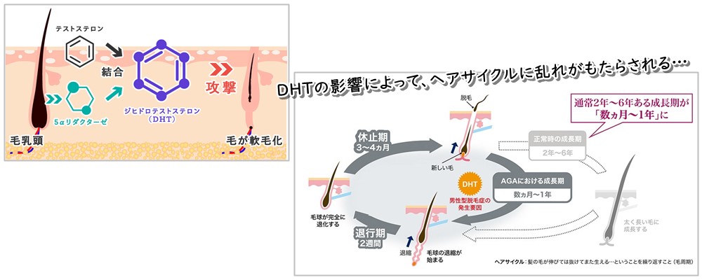 - 2. 本来、発毛を促すはずの「男性ホルモン(テストステロン)」が、悪玉の男性ホルモン「ジヒドロテストステロン(DHT)」に代謝されてしまう