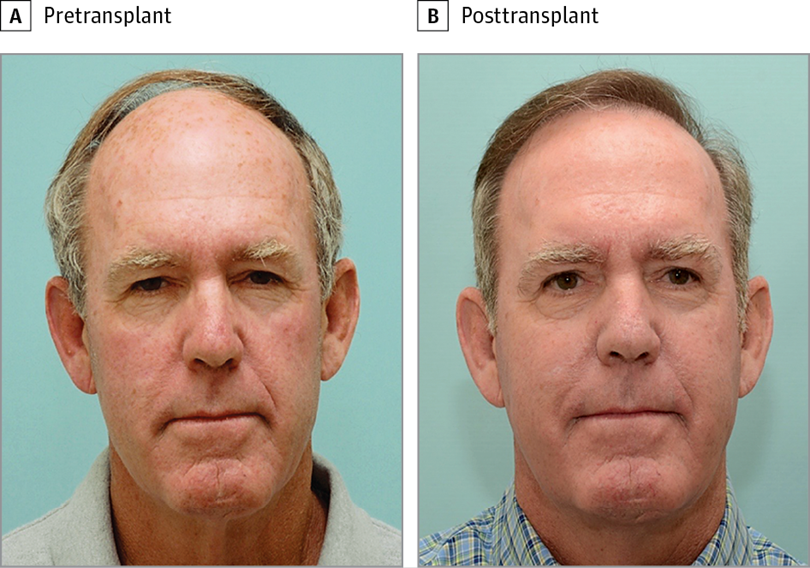 左が植毛処置の移植前(pretransplant)のもの、右が移植後(posttransplant)ということになっています。簡単に言うと、同一人物の「植毛ビフォー・アフター」ということですね。