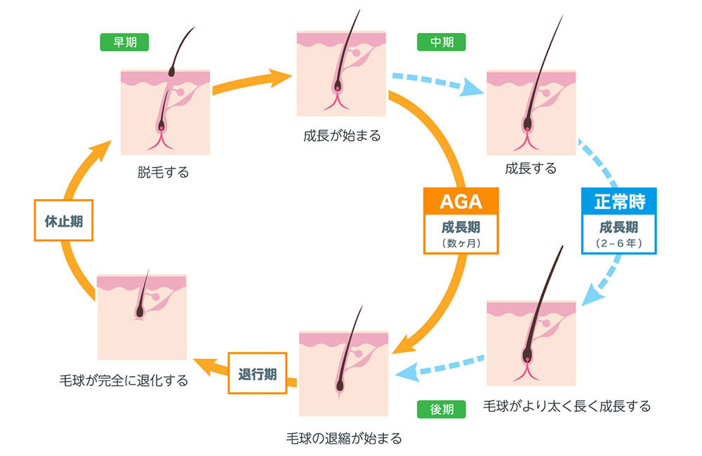 男性型脱毛症(AGA)を発症してしまうと、正常時のヘアサイクルに見られる「成長期(2~6年)」がわずか数ヶ月という短い期間に短縮させられてしまいます。こうなると、そこにある髪の毛は十分に成長することができず、細く弱々しいままにその生涯を閉じるということになってしまいます。