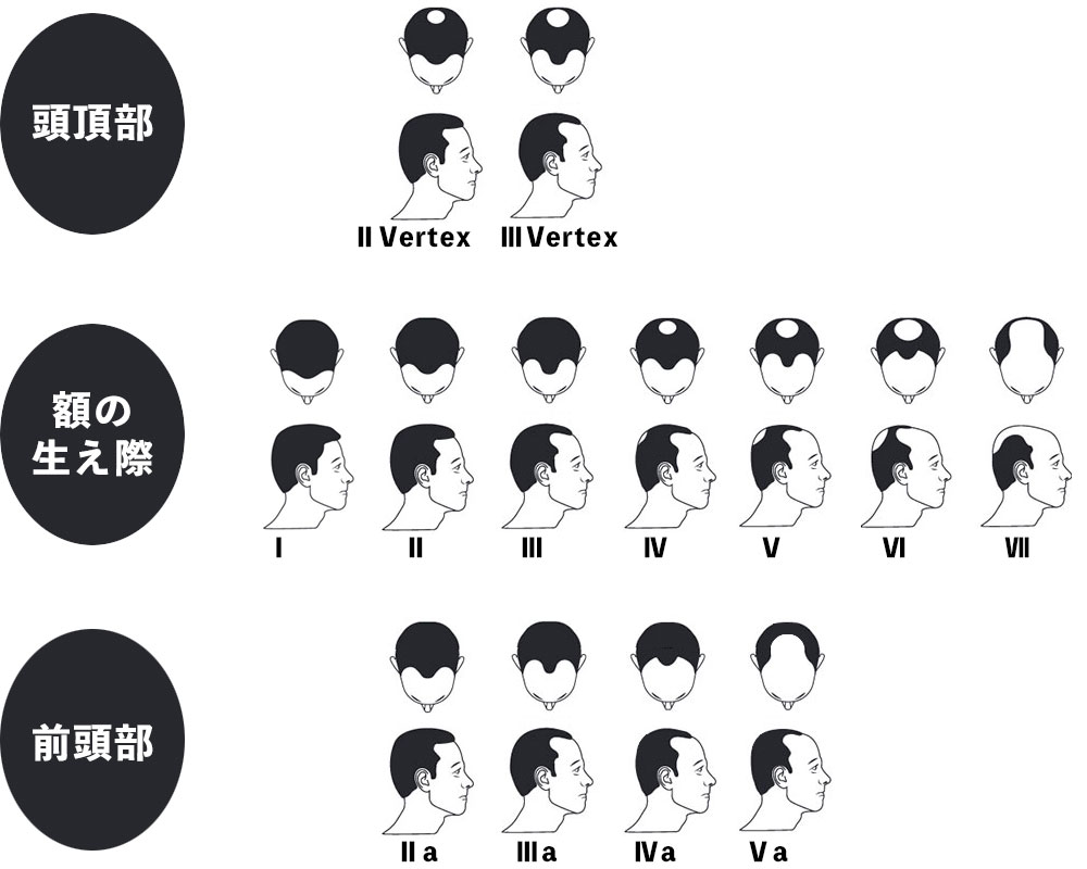 | Ⅴa型 | 前頭部がかなり大幅に後退し、頭頂部でも更なる後退が確認できるもの。 | |