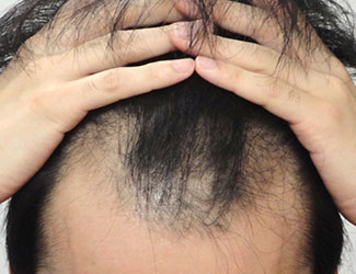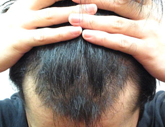 前頭部の中央とM字部分の髪が薄く、かなりの地肌の露出が見られます。当院の発毛治療によりかなりのレベルまで改善しております。M字部分についてもかなり生えてきております。