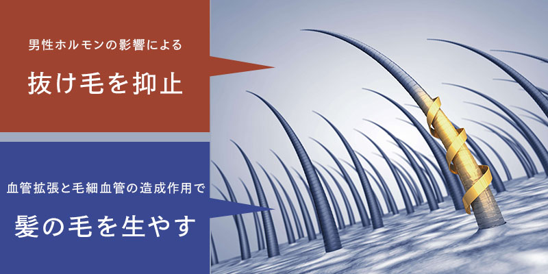 ミノキシジルは強い血管拡張作用と新たな毛細血管の造成作用で、毛根への血流を増加させます。衰えた毛根にはそれに続く血管も脆弱で栄養補給ができていません。ここに強制的に血流を送り込み発毛させるのです。